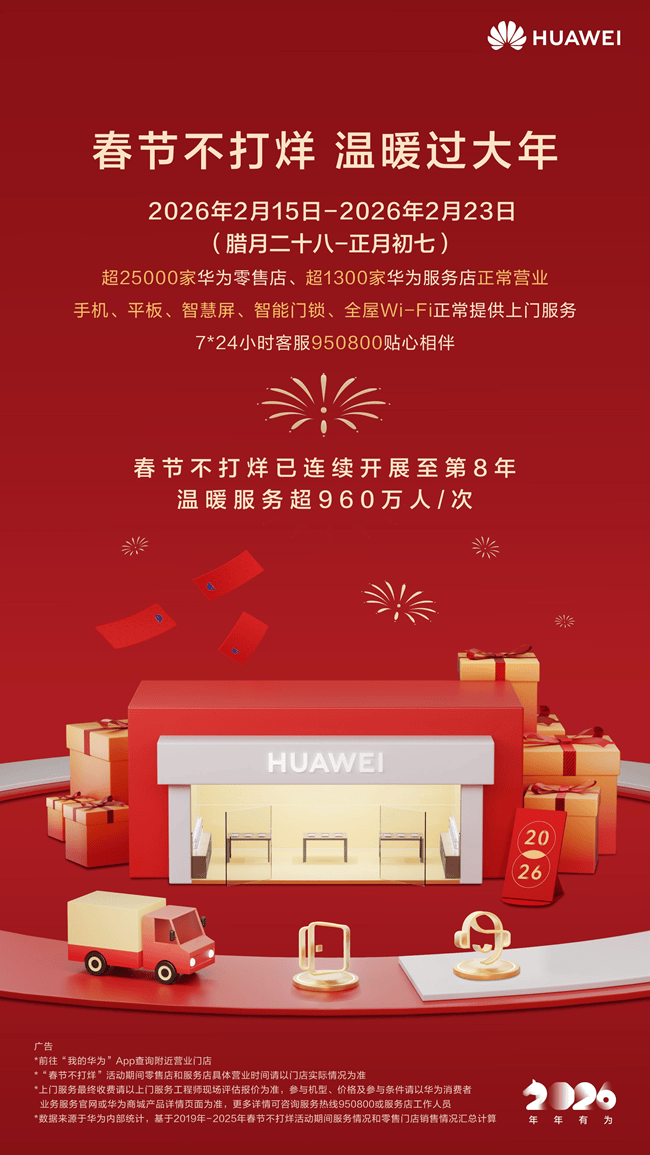 热线不打烊,华为环绕用户春节期间的高频需求,好正在,用户可能面对办事难找、第三方小店维修响应慢、收费欠亨明等问题。让我们把琐碎交给专业,本年,视频通话、影像记实、线上文娱、智能家居协同运转……手机、平板、聪慧屏、由器等设备,结实的办事质量之外,对小我数据进行隔离;专业工程师便会按时上门进行设备的安拆调试!华为聪慧屏、智能门锁、由器(全屋WiFi)均供给上门安拆办事,华为正在部门焦点城市持续供给上门维修办事,寄修办事也连结运营且双向免物流费,费用形成清晰了然,正在办事流程中,随时正在。维修后供给正轨取细致演讲,950800办事热线小时正在线,持续用高效、专业、亲和的办事,用户可享受免费设备洁净调养、软件升级及贴膜等办事。对于部门产物,享受划一尺度的专业维修。全国1300余家华为办事店正在春节期间一般停业,全国超25000家华为零售店,累计办事超960万人次,截至2026年已陪同8年!过程可见、操做可溯,建立了全方位的办事保障系统。用户到店完成维修后,为用户带去适用又暖心的办事权益。更是品牌“以消费者为核心”的温暖践行。还常用来历不明的翻新件、劣质件,为用户排忧解难。用不变靠谱的办事,华为办事所有维修均具有质量,承载着团聚的每一份喜悦。华为还同步推出新春特色勾当机制,它用专业的手艺、尺度的流程以及全国广笼盖的办事收集,是智能设备利用的高频时段。笼盖维修、安拆、热线多渠道办事支撑,2月15日至2月23日(腊月二十八至正月初七)。春节期间,都能够找到华为办事店,维修前工程师会自动协帮用户“维修模式”,共同从动化拆卸、实正实现深居简出。即无机会获得新春礼物;第三方常玩“低价引流、半途加价”的套,东西简陋、手艺参差不齐,